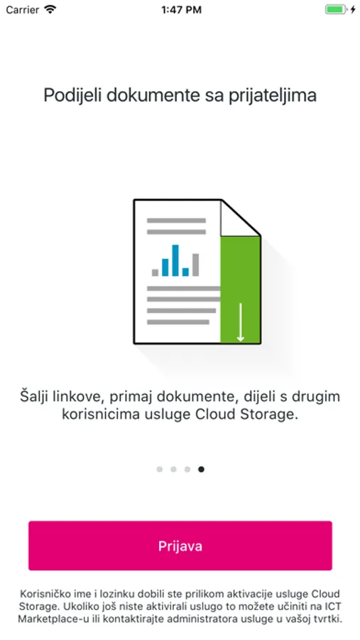 Aplikacija Cloud Storage Hrvatskog Telekoma poslovnim korisnicima omogućuje pristup diskovnom prostoru tvrtke te jednostavno pregledavanje, slanje i komentiranje dokumenata koji su pohranjeni na diskovnom prostoru s ostalim korisnicima unutar tvrtke.