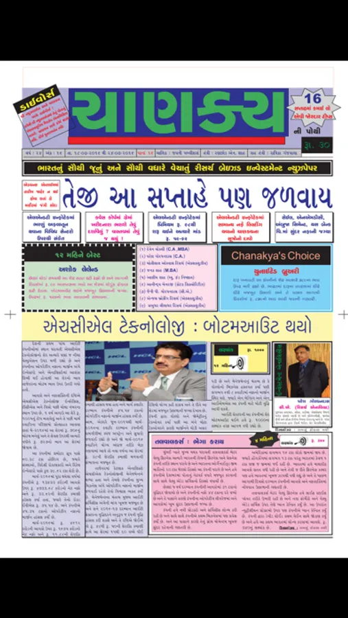 Chanakya is the No.1 Gujarati Investment Weekly which provides in-depth news and analysis on the Indian Stock Markets , IPOs, Mutual Funds, Bullion and many other investment avenues. It provides technical (chart) analysis as well as fundamental analysis for stock market scrips.
