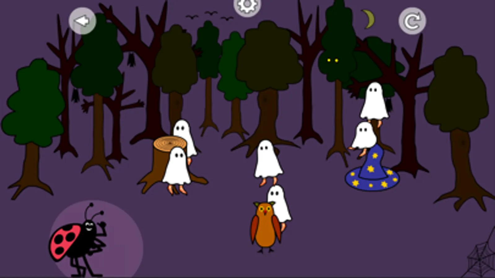 • I skogen leker vi kurragömma. Ni får leta efter spöken som har gömt sig. Hitta det spöke som nyckelpigan frågar efter (t ex på kistan) och dra det till nyckelpigan.