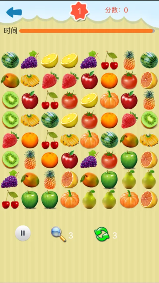 用不超过三根线把两种相同的图片连接起来,并且不碰到其他图片,则消除相同的果蔬,消除完所有的图片,你就通关了~