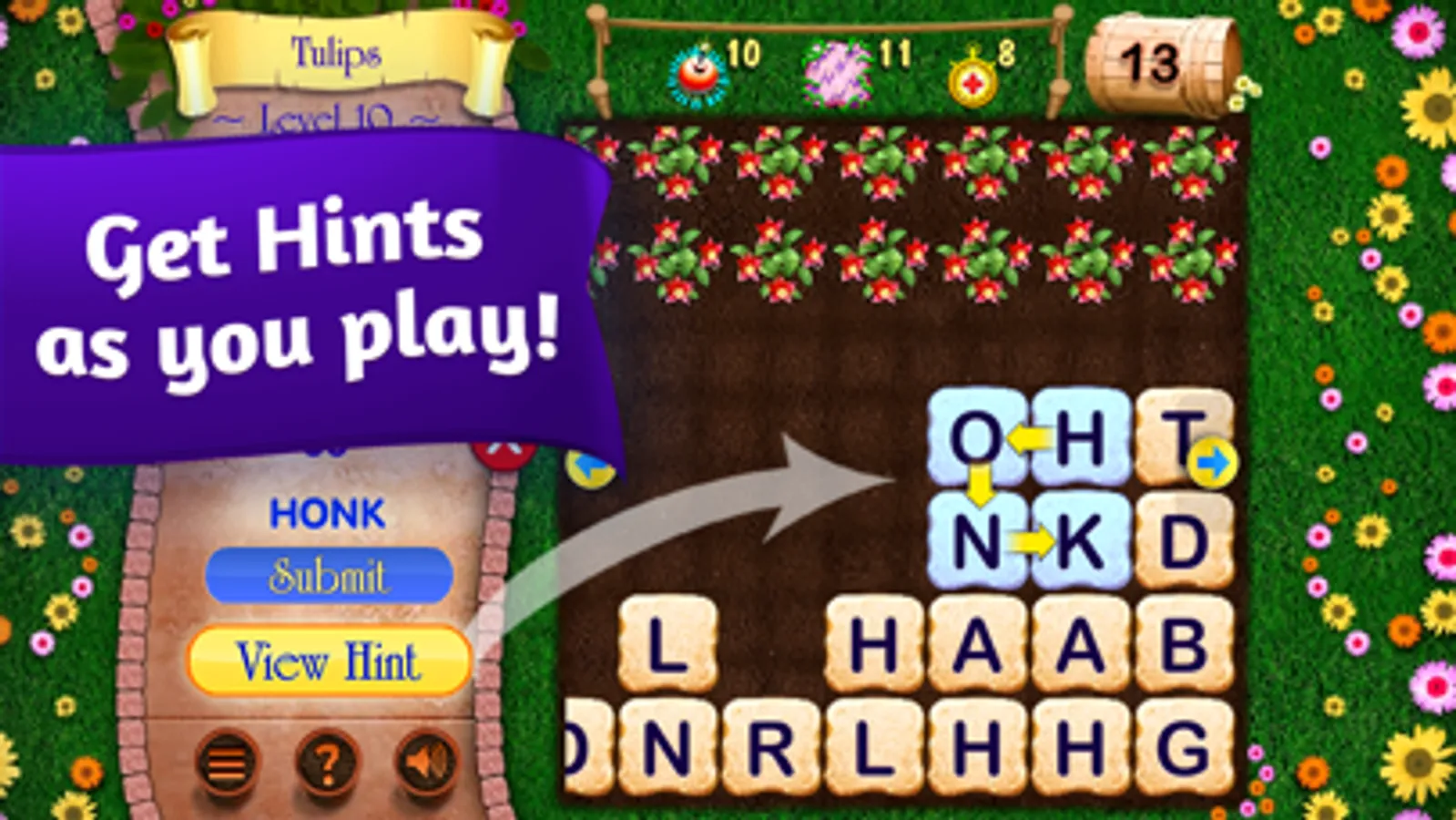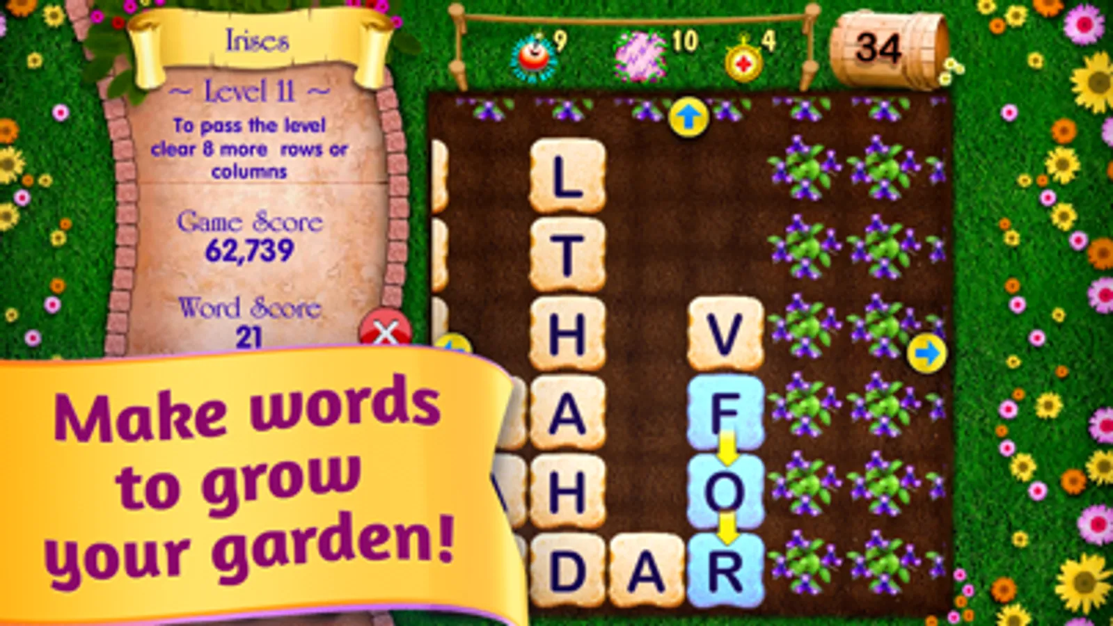 Spell words by linking letters, clearing space for your flowers to grow. Can you clear the entire garden?