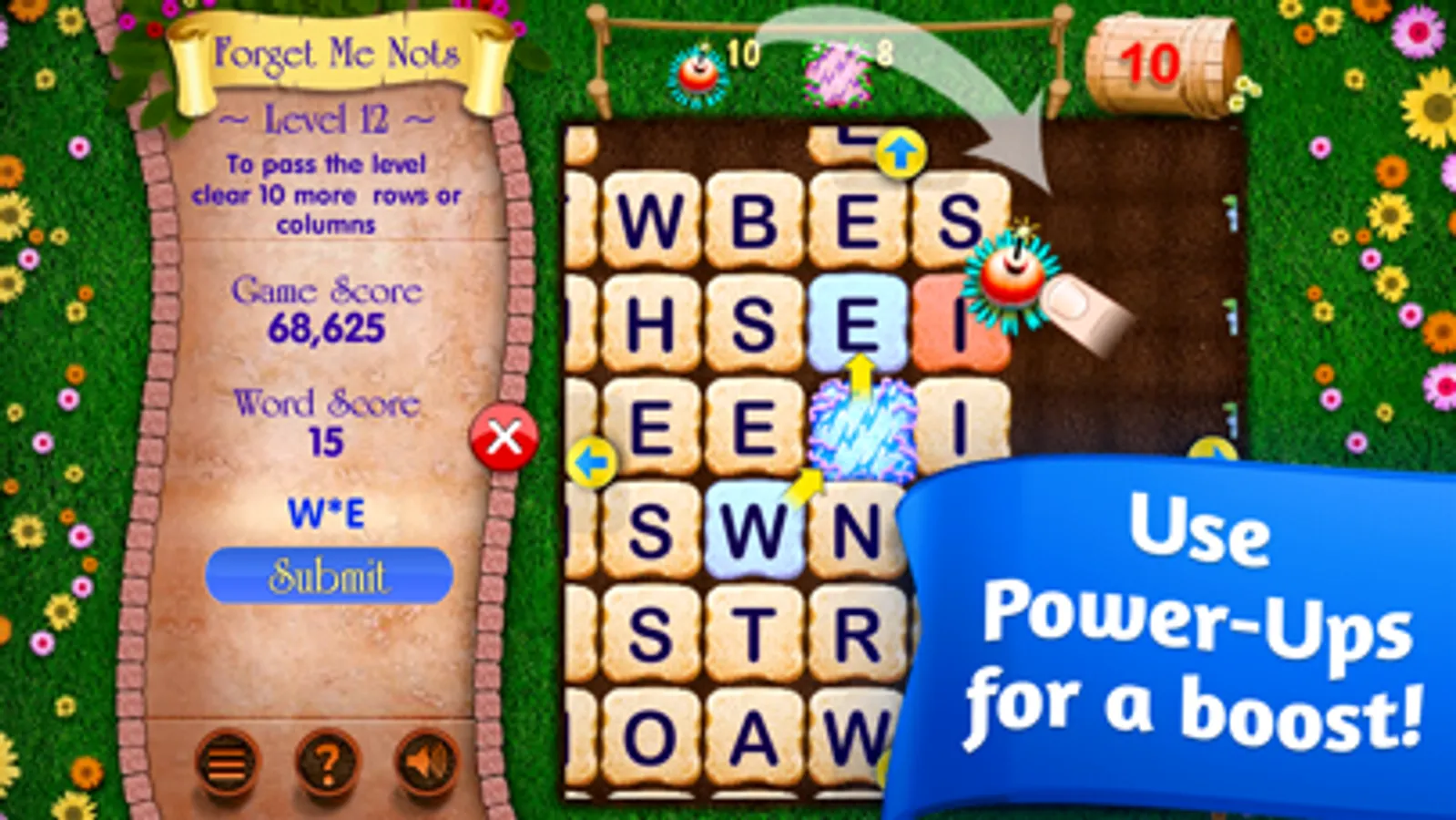 Click and drag over letter tiles to form 3-letter and longer words. Clear entire rows and columns to complete the level goal. Clear more to earn Power-Ups: use Bombs to destroy groups of letter tiles, make longer words with Wilds, and extend the level timer using Time-Guards!