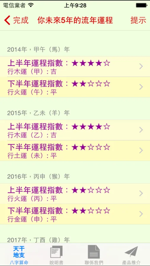 因此,《八字神數算命機》的運程批算結果,使讀者用戶們十分容易明白,是以指數來決定批算結果的好與壞優與劣的,指數分成以下五等級: