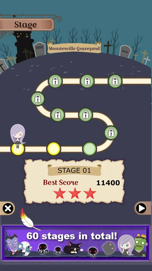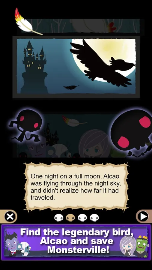 Atop Mt. Yeti in Monsterville lives a gigantic bird, Alcao. Its feathers are said to grant eternal life to anyone who catches one of them. One night on a full moon, Alcao was flying through the night sky, and one of its feathers fell to the ground. This caused the zombies that were sleeping to wake up, as they wanted the feather for themselves! It's up to Gabrielle and her friends to send the zombies back to their graves, and return the feather back to Alcao!