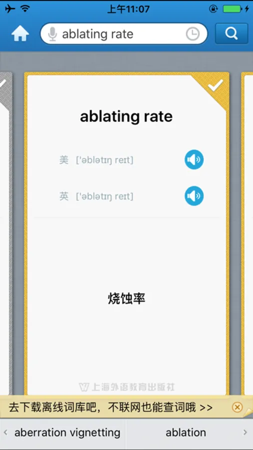 (5)离线查询:下载安装离线包后,在无网络情况下,一样可以查词、发音,无需GPRS流量。