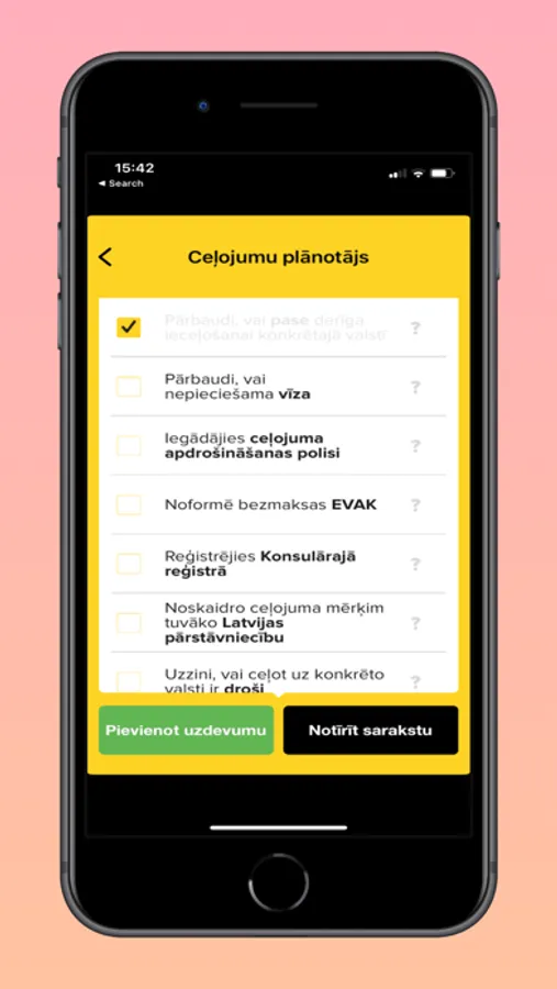 - Ceļojumu plānotāja funkciju – atgādinājumus par svarīgākajiem uzdevumiem gatavojoties braucienam (piemēram, noskaidrot, vai ieceļošanai konkrētajā valstī nepieciešama vīza u.c.), iespēja pievienot arī personīgus atgādinājumus;