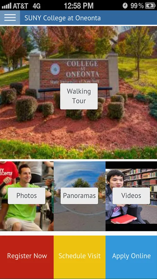 Thinking of attending SUNY Oneonta? Prospective students and families can explore the campus and learn about our unique programs, culture and sports teams through a self-guided tour. Whether at home or on campus our interactive student guide will accompany you as you explore our offerings through the use of the GPS-enabled campus map, student videos and photos.