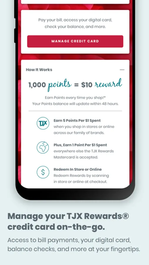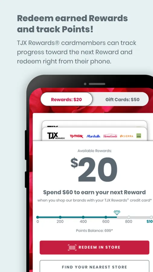 - Explore our enhanced TJX Rewards experience! Now it’s easier than ever to access your earned Rewards Certificates digitally, check your points balance, manage your TJX Rewards credit card account on-the-go, and redeem your rewards in-store.