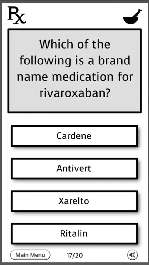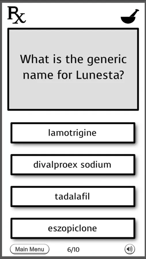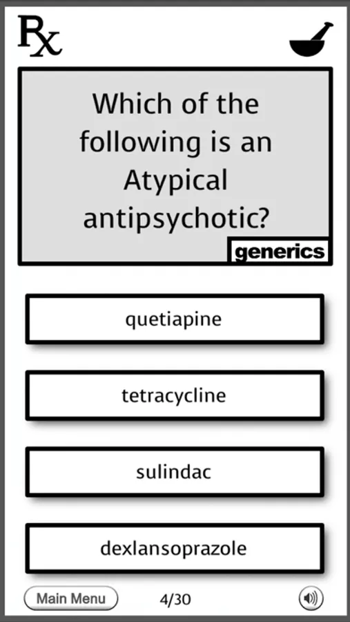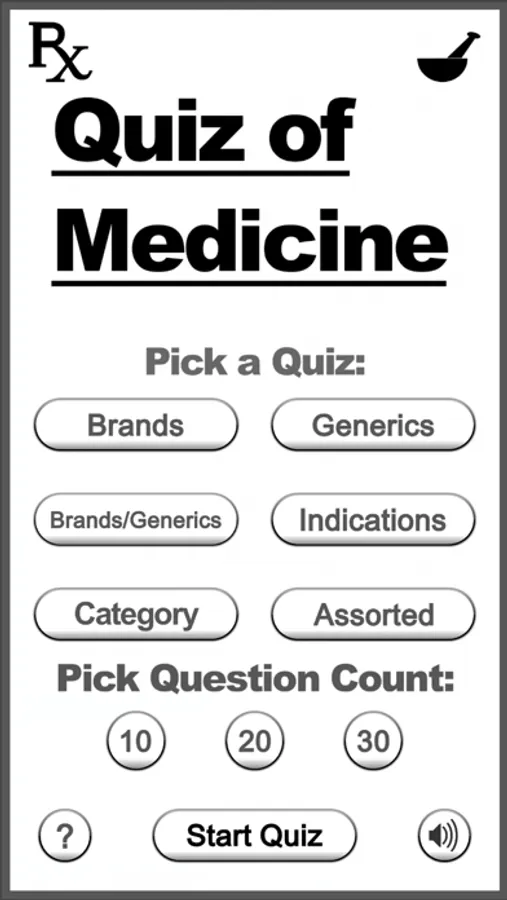 There are six quiz types in this app; Brands, Generics, Brands/Generics, Indications, Categories, and Assorted.
