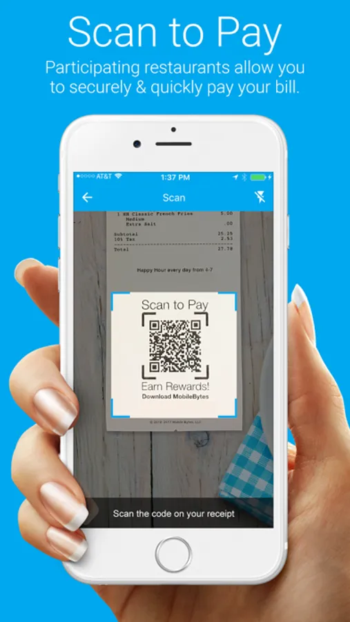 MobileBytes allows you to scan a code on your guest receipt to earn loyalty points. All your points are managed in the app and automatically converted to rewards when spending levels are achieved. The more points you have the higher your reward level and the better your reward values. In participating restaurants, you can also scan a code to pay your tab directly from your phone.