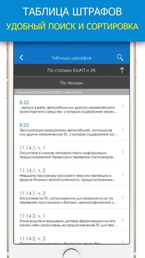 *** Удобный поиск по всем штрафам, с сортировкой по видам нарушений или по статьям КоАП и УК.