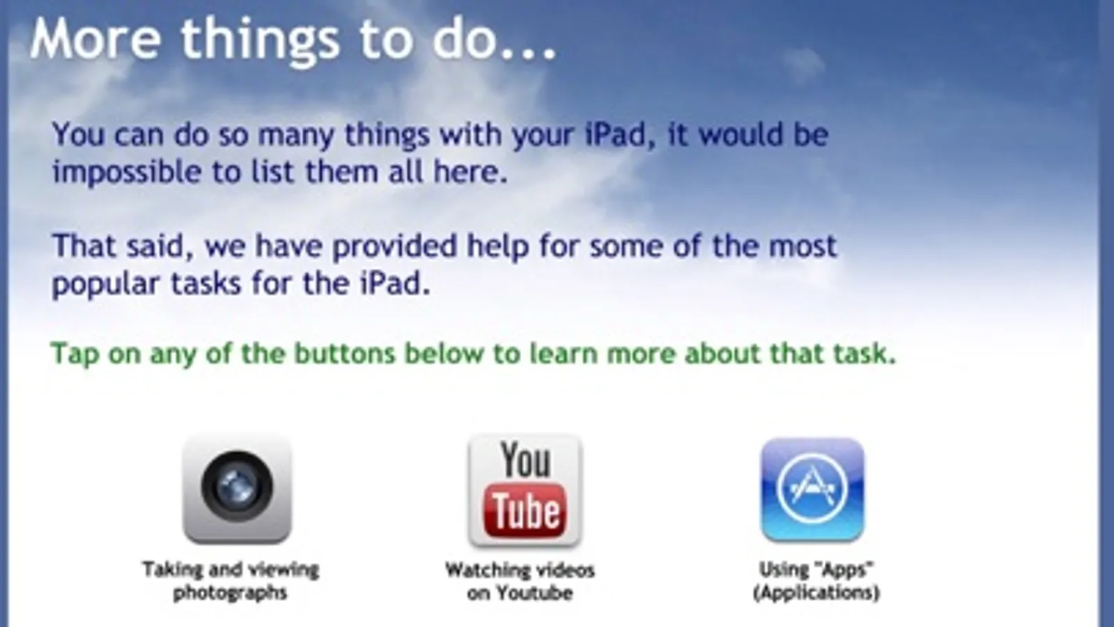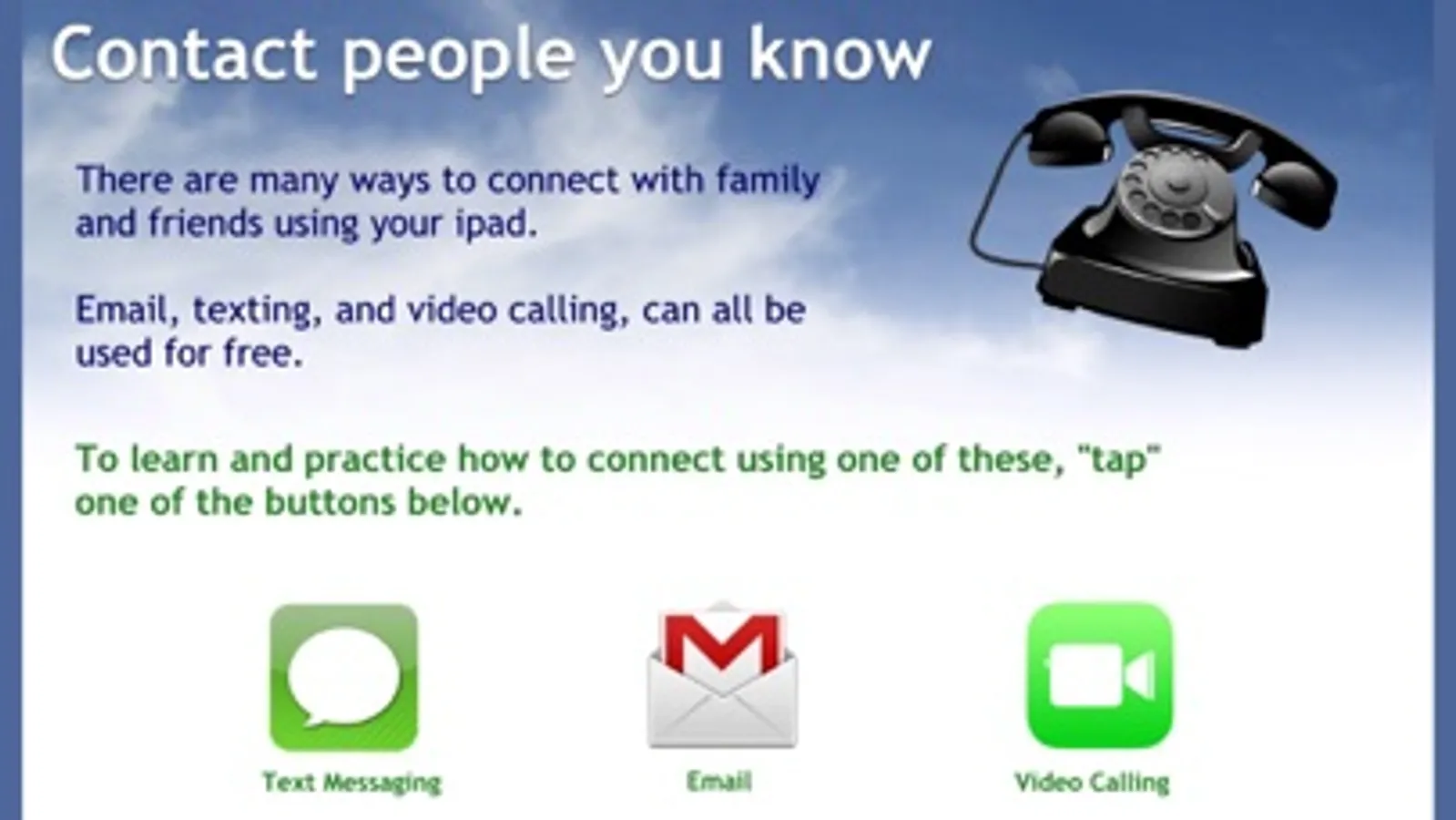 iPad® training for older adults who are unfamiliar with tablet and/or computer technology, easy step-by-step instructions on every screen in large type and simple language by national award winning nonprofit.
