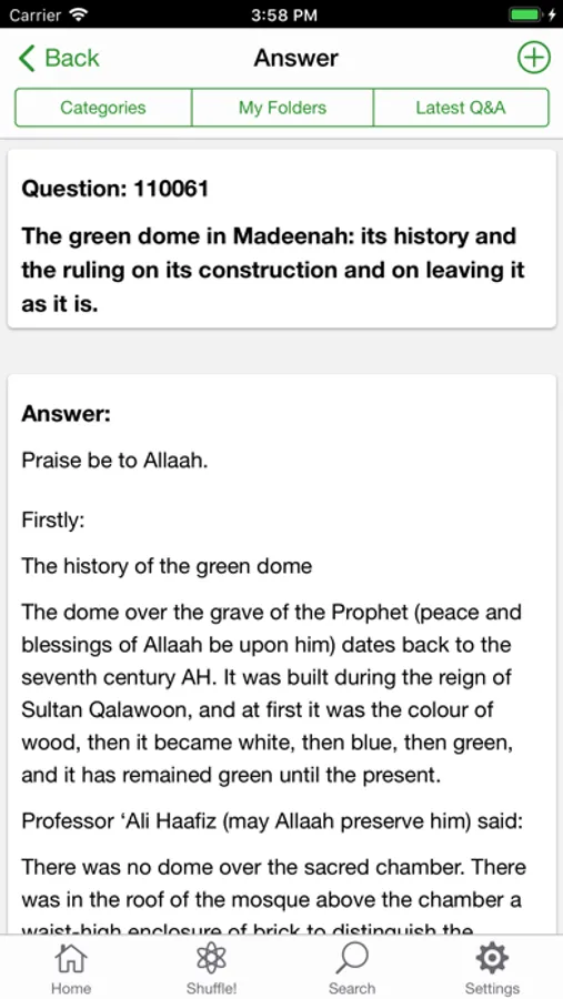 This App aims to provide intelligent, authoritative responses to anyone's question about Islam, whether it be from a Muslim or a non-Muslim, and to help solve general and personal social problems. Responses are composed by Sheikh Muhammed Salih Al-Munajjid, a known Islamic lecturer and author. Questions on topic such as theology, worship, human and business relations, or social and personal issues.