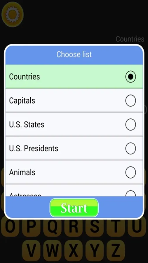 - 10 categories: countries, capitals, US states, US presidents, animals, actresses, actors, films, music, soccer teams