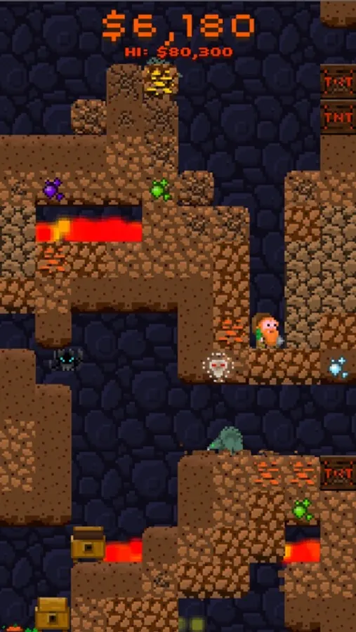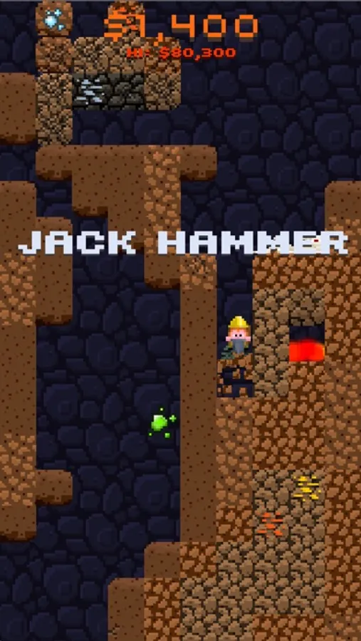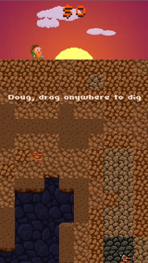 Now it's your turn. Help Doug dig deep down under the earth in the quest for shimmering jewels and precious gold. Go farther and deeper than any of your friends. Find more gold than anyone in the world. Oh but watch out for colossal cave-ins. No they're really colossal—you won't believe it. And creepy monsters. And bottomless pits. Ah, don't worry it's just a game.