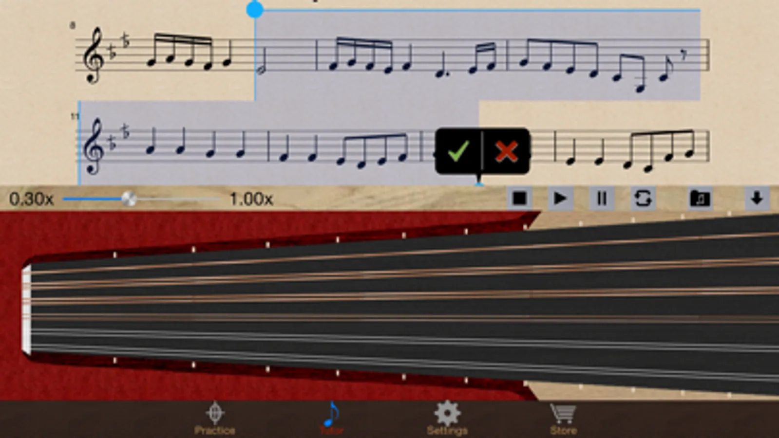 You will be able listen to the song, watch it being played on the Oud and highlighted on the sheet music. You can slow the music down, speed it up and select the notes you want to practice. Turn on looping mode to hear and watch the selected notes play over and over.