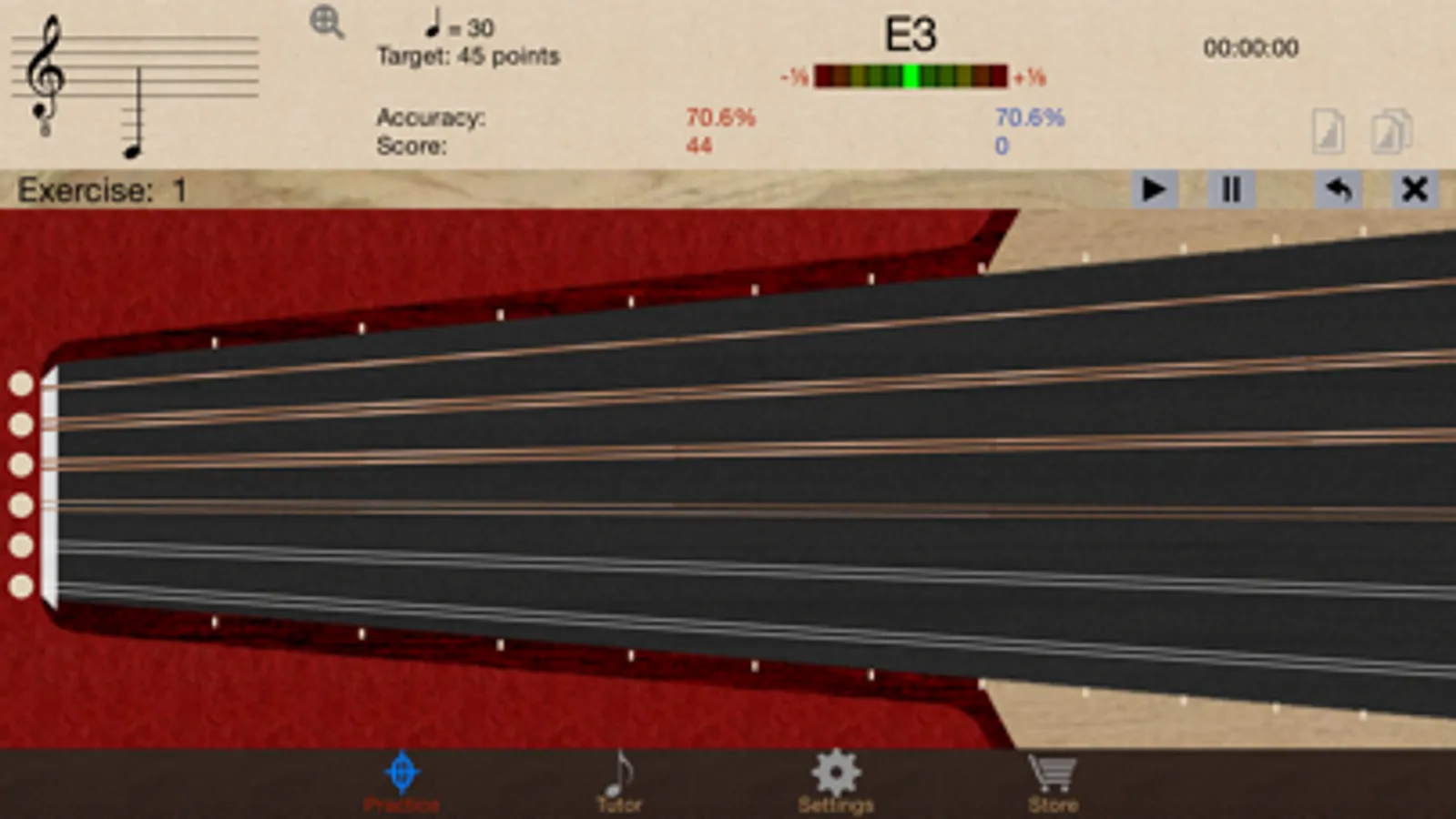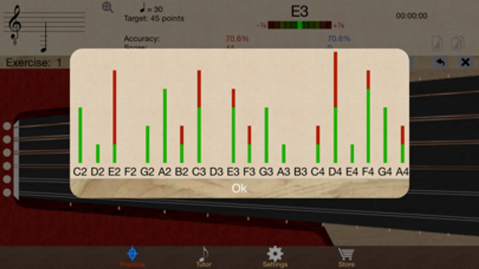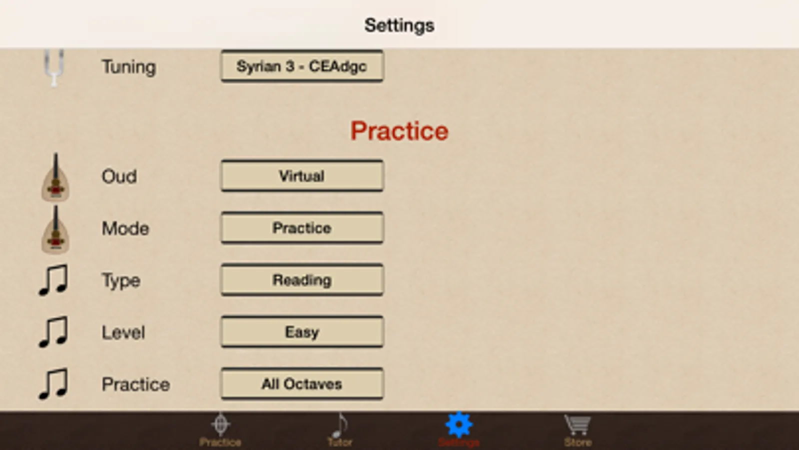Start with the practice screen and learn the names of the notes, their positions on the staff and where to play them on the Oud. Choose one of a dozen common tunings. Choose the octave or string you want to practice and check your stats to see what notes you need to work on.
