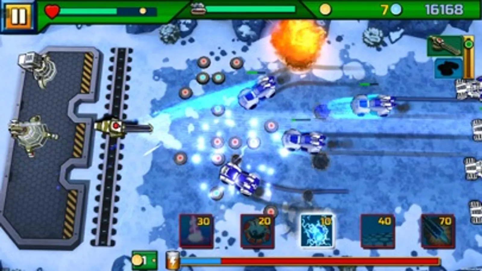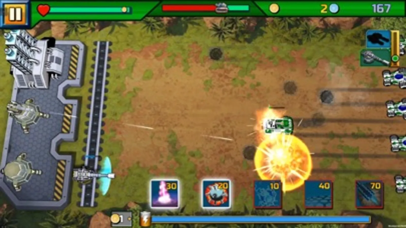 Control the turret which moves in front of your base, and can fire with different weapons of your choosing. The turret is protected by a force field, so it can 'catch' the enemy shells, preventing the damage to the base.