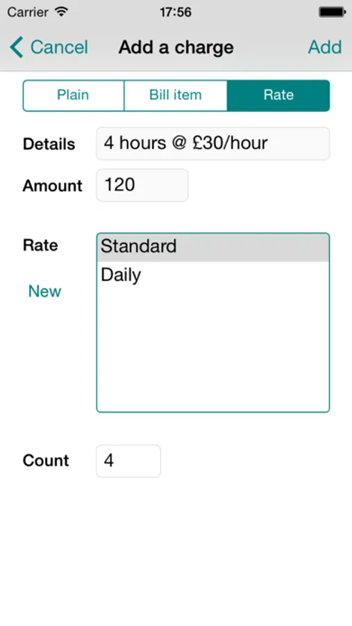 Charge lines can be added for billable items, rate charges (per hour, per day, per metre, etc.) or ad-hoc entries. Rates & bill items can be set up in advance or added as required.