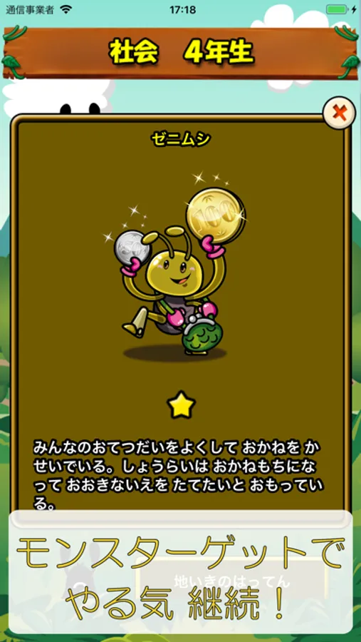 小学校4年生の社会アプリの決定版!学習の進み具合に合わせて単元を選択して、効率的に復習できます。4択のクイズ形式という使いやすさ、勉強のご褒美にモンスターを集めていく楽しさで、子供が継続的に勉強します。(iPad、iPhoneの両方に対応)