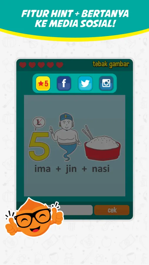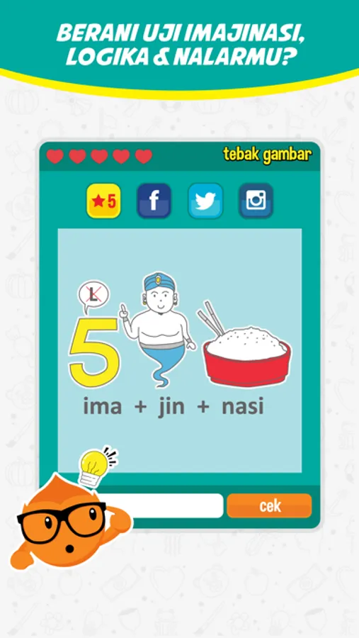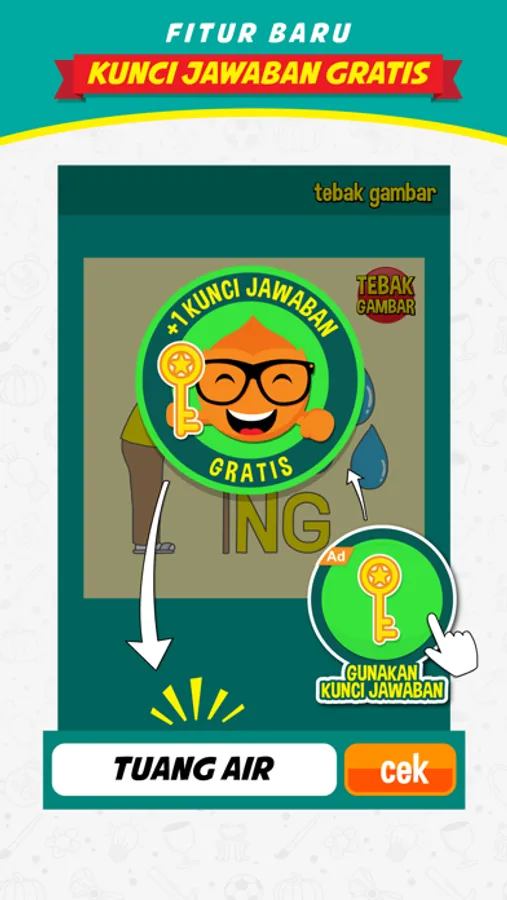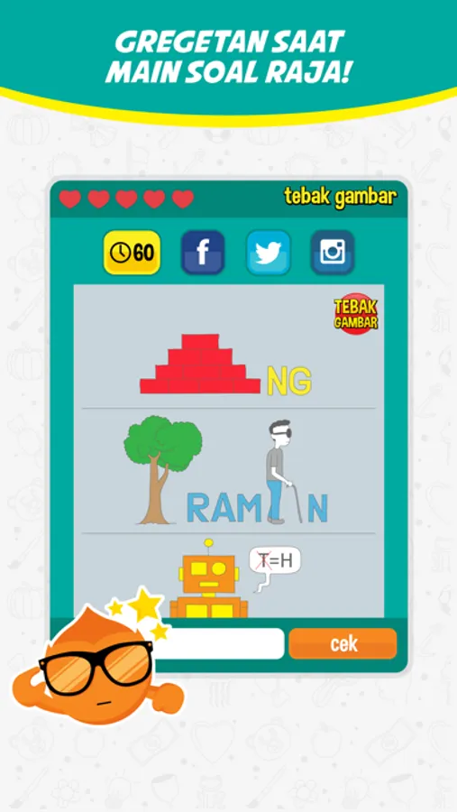 Tebak Gambar, challenging imagination, logic and reason. Tebak Gambar game is a light brainstorming game, pieces of picture are set as they form new vocabulary, which is adopted from daily slang, unique and funny phrase, or even any happening events and issues. This game is so creative and unique in testing our brains, in order to find the answers of questions. When one have succeeded in answering one question, he will get even more curious to figure out the next picture. The higher level, the more curiosity to finish the game. The player will be pursued to solve all 3700 pictures, which are divided in 185 levels. In the end of every level, there's an extra challenge, where it has to be solved before the time is over. Solve last question Picture is a main requirement to reach higher level. But watch out, don't lose all 'hearts' because it will give you punishment. Let's guess the picture, fun and amusing!