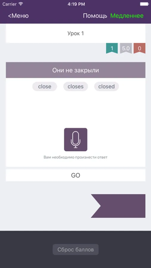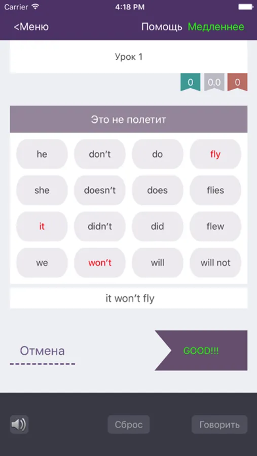 Даётся возможность сначала тренироваться составляя фразы из предложенных слов, затем довести до совершенства навык на голосовом тренажере.