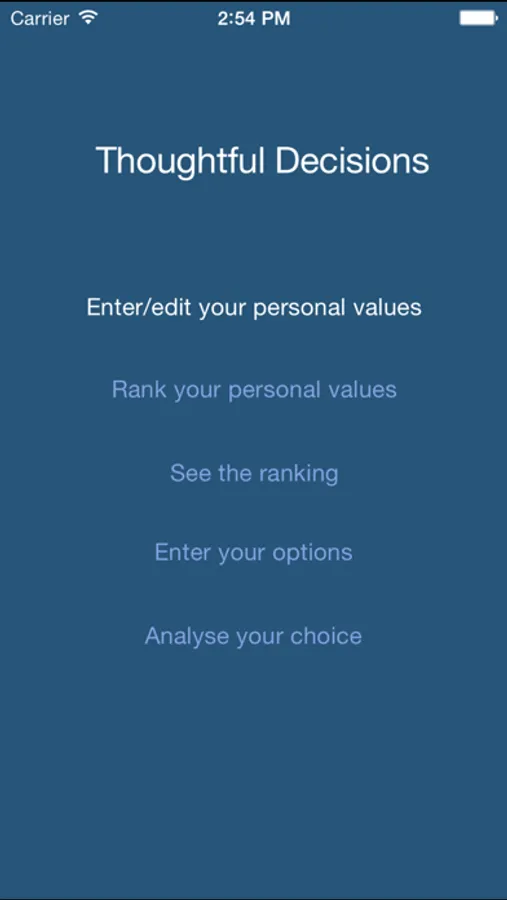 This app will help you analyse your important decisions - by first identifying and ranking your core personal values, and then looking at each choice you have to see how consistent it is with your core values. You will then get a list of your options scored and ordered, so you can see which of them appears to be most in line with what you define as being important to you.