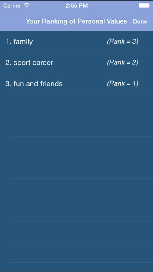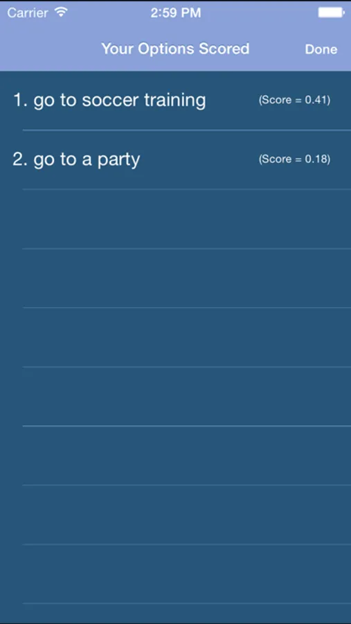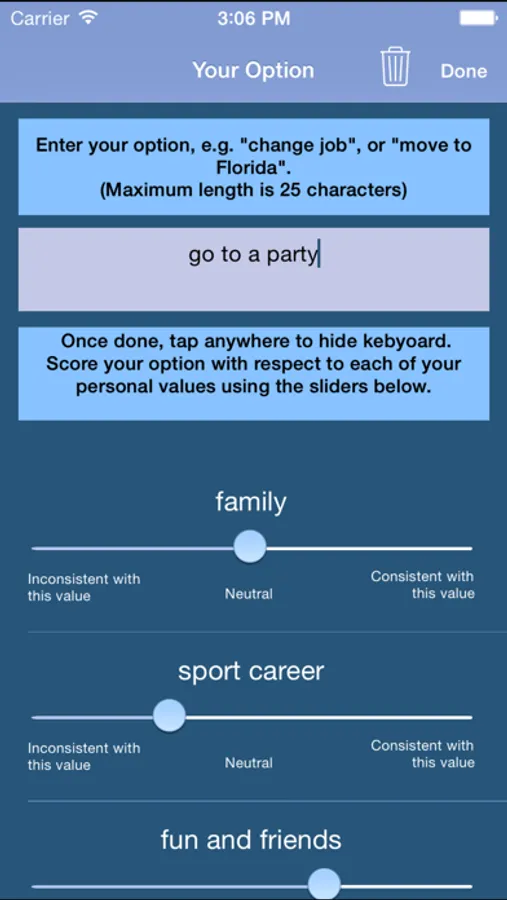 In this paid version you can define as many personal values as you like, and compare multiple options. Your personal values are saved on your device, so you do not need to re-enter and compare them each time you want to use the app to help you make a choice.