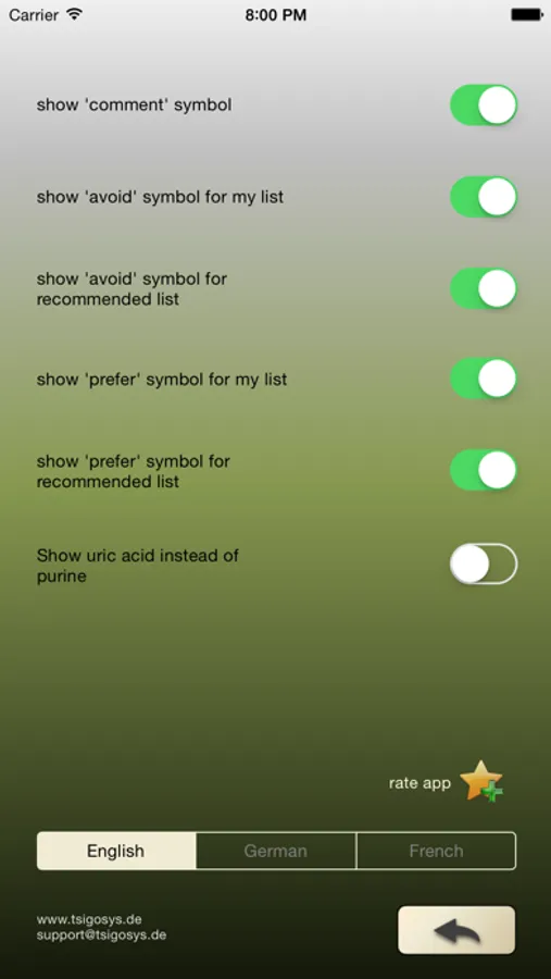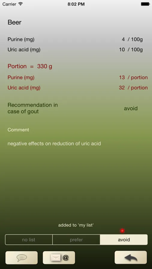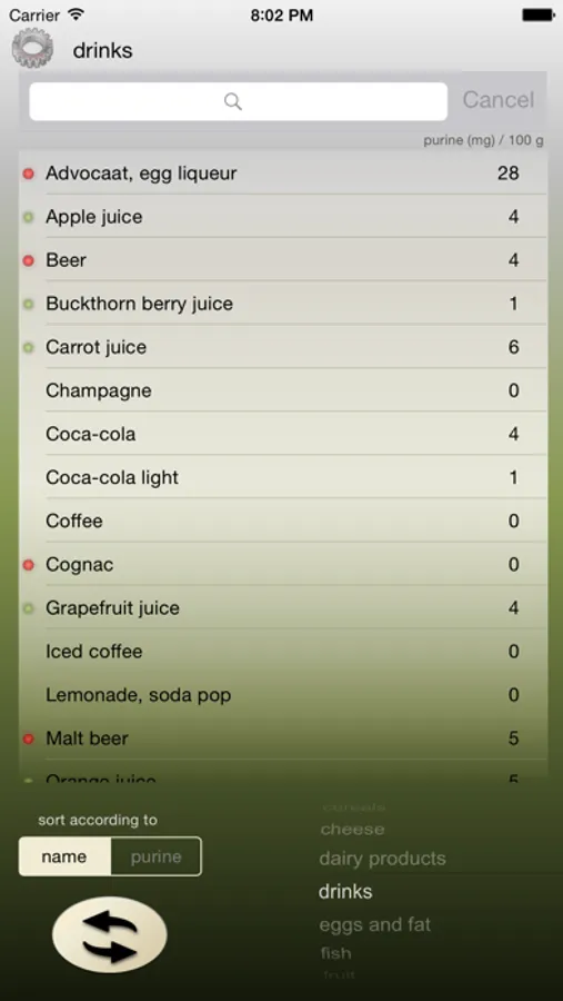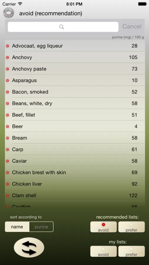 An exclusive table of purine and uric acid details of approximately 600 foods, grouped in categories.