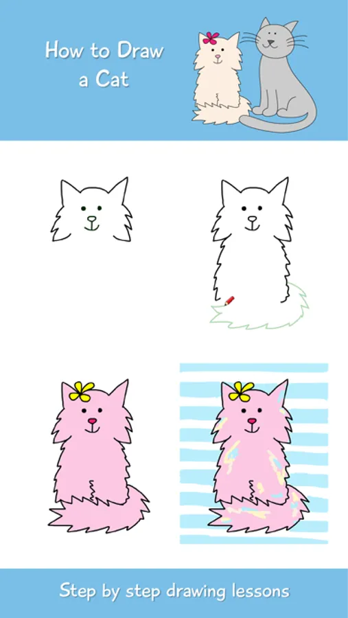 Kids can learn to draw a cat in 6 to 8 steps starting from a basic circle and ending with a real new cat friend. We will guide them through this step by step process.
