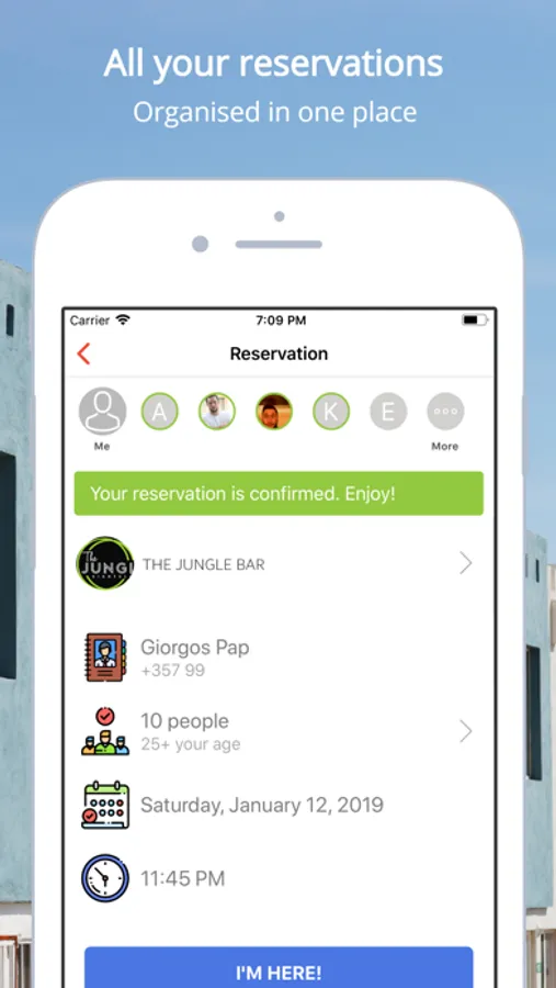 Make your reservation in just three taps and wait for a confirmation. How will your friends be notified? Simply by tagging them in the reservation. Everyone will be notified if the reservation is accepted or if the venue is full and you need to book somewhere else. And since your friends are using the app, they all know directly when and where to go (location information).