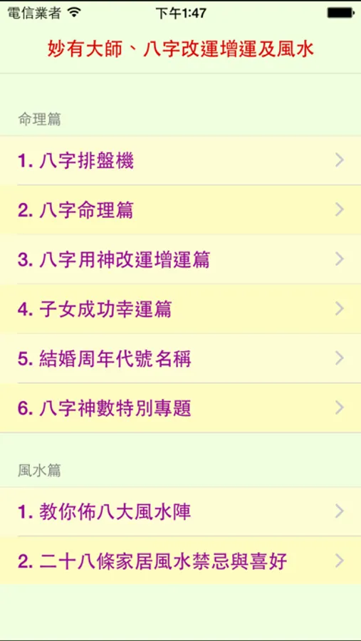 1) 如何尋找命中貴人 2) 家居增運學 3) 行為改運學 4) 工作環境改運學 5) 飲食改 運學 6) 偶像改運學。