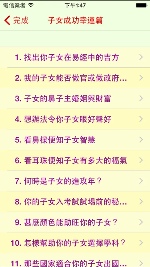 1) 找出你子女在易經中的吉方。2) 我的子女能否做官或做政府工作? 3) 子女的鼻子主婚姻與 財富。4) 想辦法令你子女眼好聲好。5) 看鼻樑便知子女智慧。6) 看耳珠便知子女有多大 的福氣。7) 何時是子女的進攻年? 8) 你的子女入考試試埸前的秘密功法。