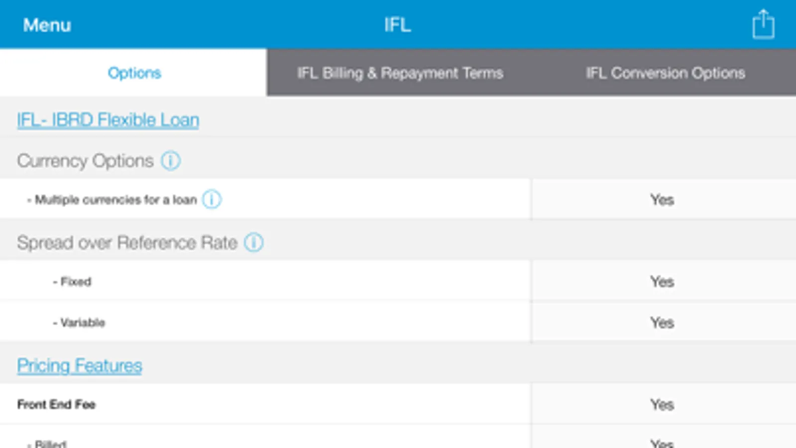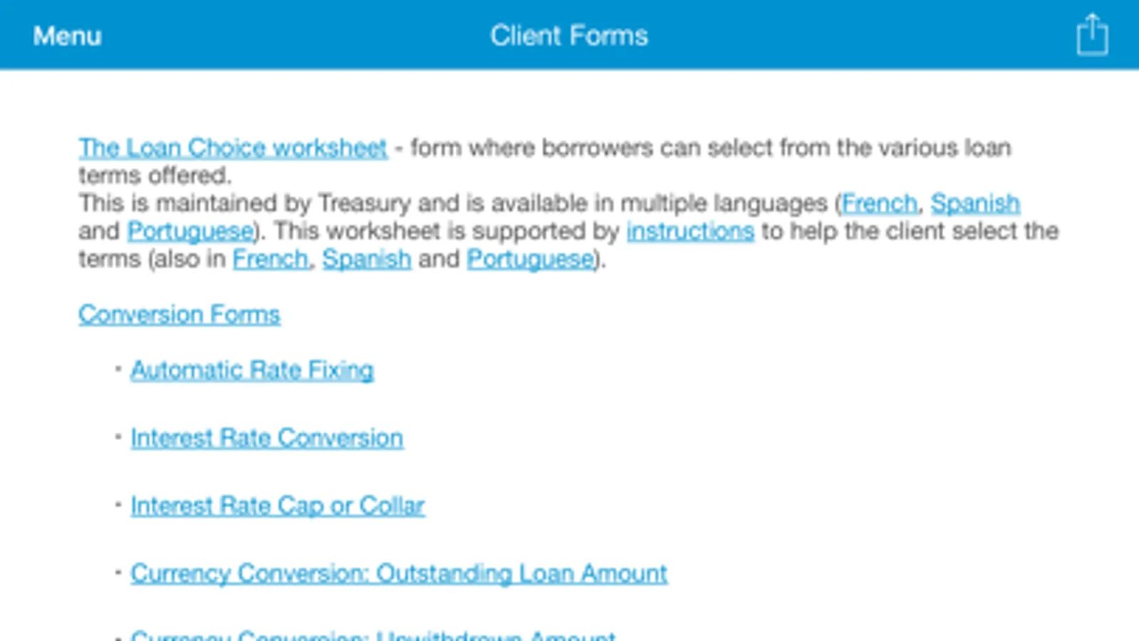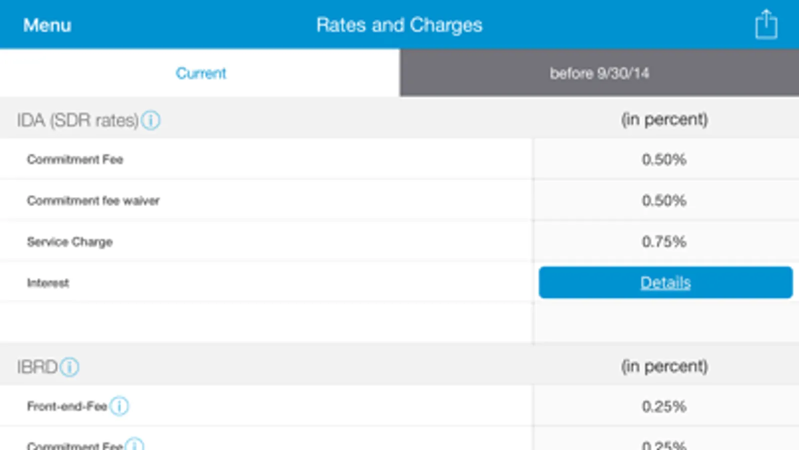 The financial instruments App presents to clients information on financial instruments that are offered though the World Bank Group's various financiers and products. These include IBRD loans, IDA credits, Guarantees. The App describes the terms of these financial products and displays their rates, offers reference information and the ability for clients to complete required forms online. All information in the App is public.