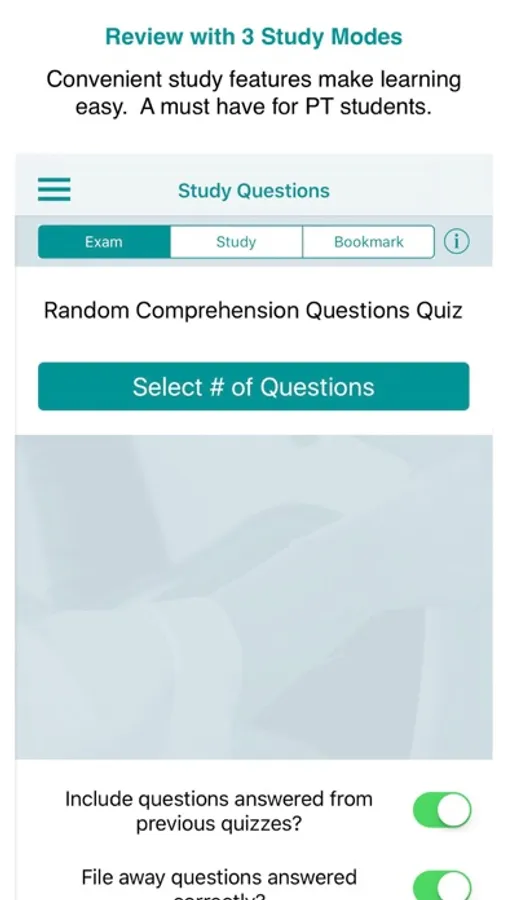 •Study/Exam/Bookmark modes are available for NPTE-style review questions.