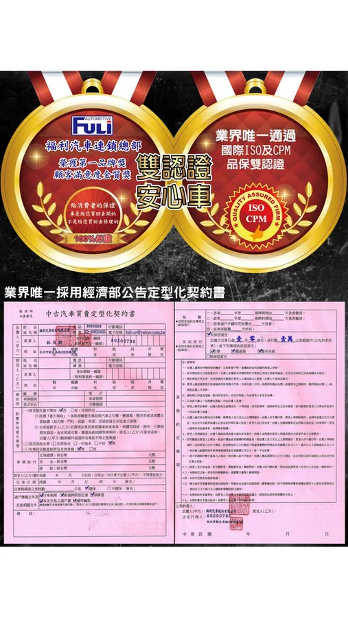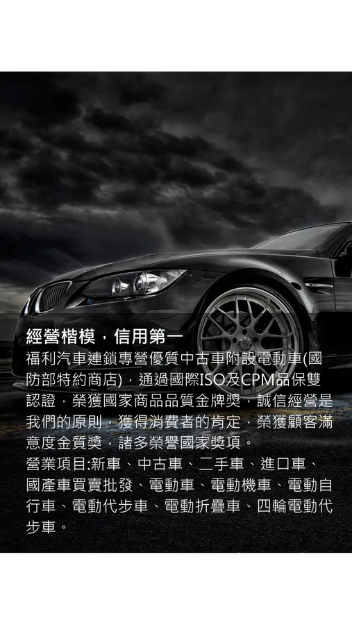 福利汽車連鎖專營優質中古車附設電動車(業界唯一國防部特約商店),業界唯一通過國際ISO及CPM品保雙認證,榮獲國家商品品質金牌獎,誠信經營是我們的原則,獲得消費者的肯定,榮獲顧客滿意度金質獎,諸多榮譽國家獎項。營業項目:新車、中古車、二手車、進口車、國產車買賣批發、電動車、電動機車、電動自行車、電動代步車、電動折疊車、四輪電動代步車。