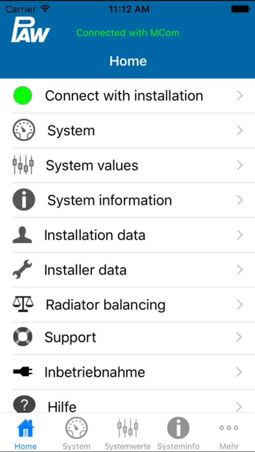 Important note: An integrated demonstration function allows you to test large parts of the functions. For a full use of the app a connection to a PAW HeatBloC® MC system is required.