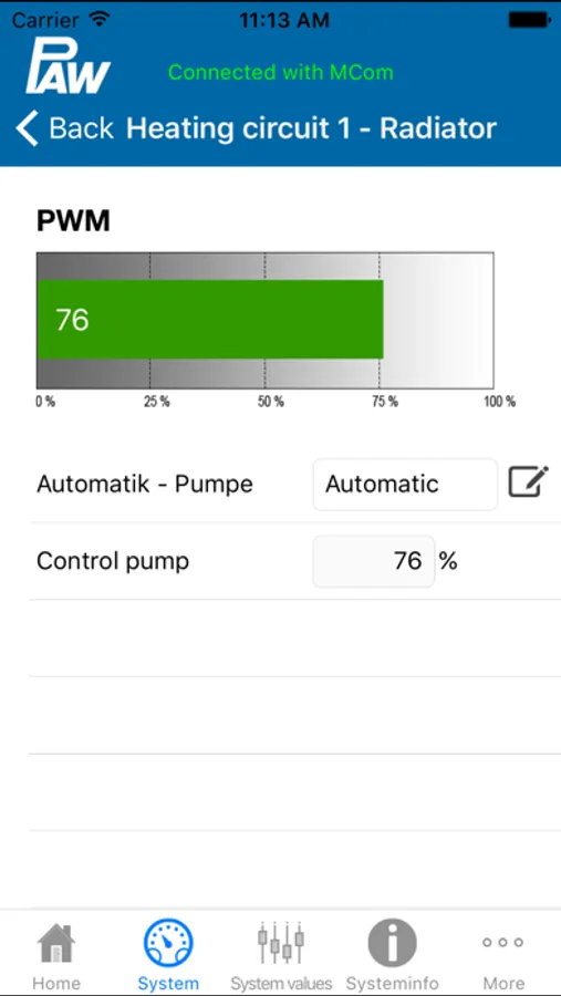PAW HeatBloC® app for the configuration, controlling and monitoring of the PAW HeatBloC® MC system.