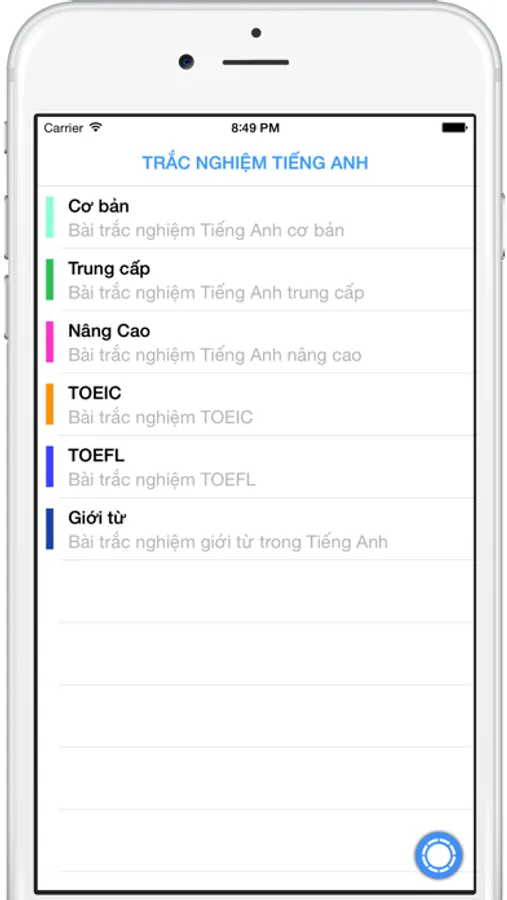 Bạn đang cần rèn luyện để duy trì và nâng cao khả năng Tiếng Anh của mình một cách thuận tiện mọi lúc mọi nơi? Bạn đã tìm đúng cái mà bạn đang cần. Với ứng dụng [Trắc Nghiệm English - Duy trì và nâng cao khả năng Tiếng Anh của bạn] bạn có thể làm bài tập trắc nghiệm Tiếng Anh để duy trì và nâng cao khả năng Tiếng Anh của mình mọi lúc mọi nơi.