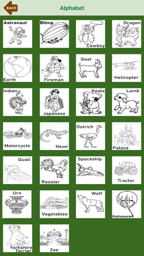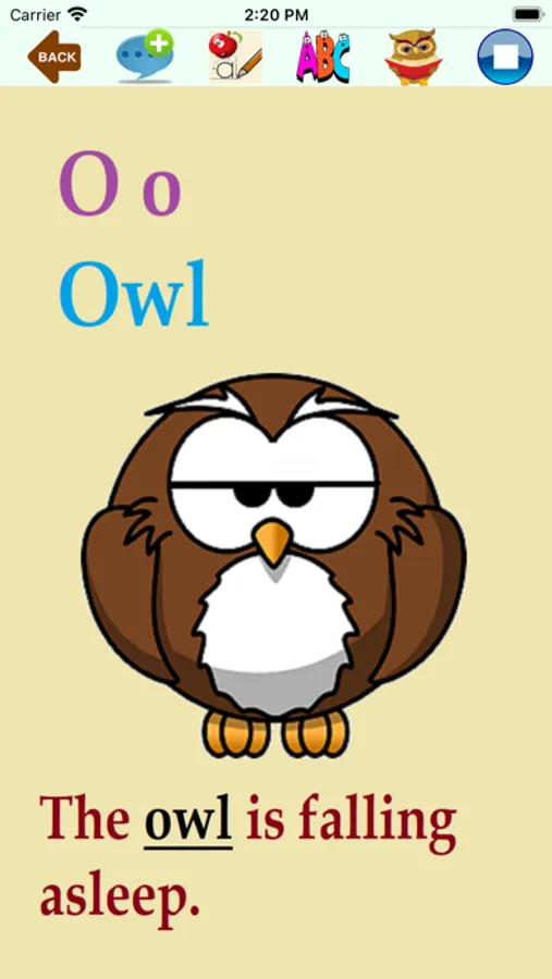 The app displays each letter of the alphabet and associate that letter with an object or animal. There will be animation to making learning fun and entertaining. In addition to the alphabet, there will be a sentence made using the letter to describe what the animation is about. An additional page will include more objects or animals starting with the letter selected with audio.