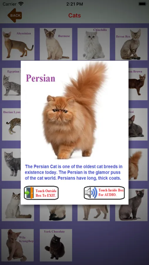 Additional function is Cats with a description of the cat. Audio is added to for the description.