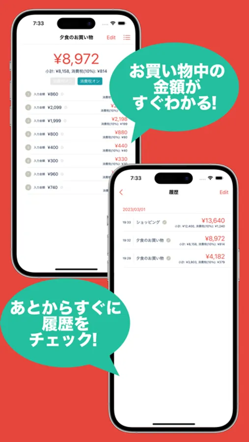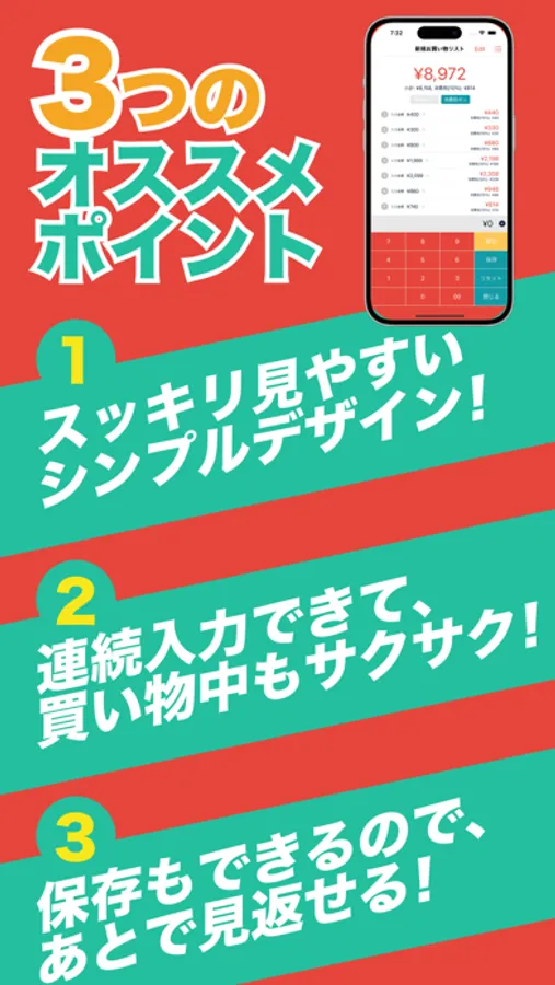 お買い物中でも値段をみながらサクサクできる連続入力。すっきり見やすいリストデザインでしっかり金額が確認できます。もちろん消費税10%対応!一発切替で消費税分をパパっと確認できます。