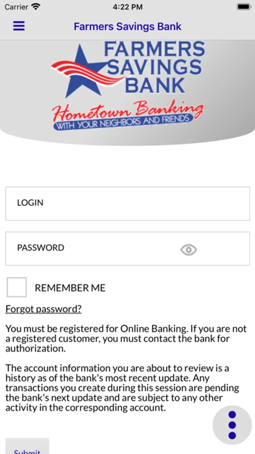 Farmers Savings Bank mobile banking app lets you view your balances and transaction history, as well as perform funds transfers and loan payments between accounts within Farmers Savings Bank. Access is available free of charge to our online banking users; online banking is required. Your mobile carrier’s text messaging and web access charges may apply.