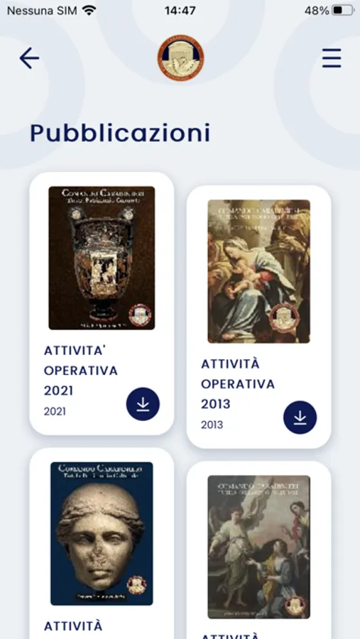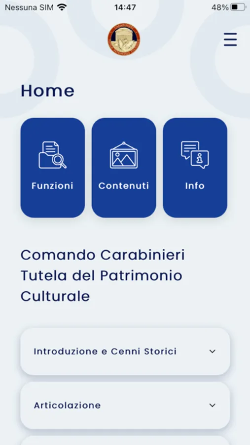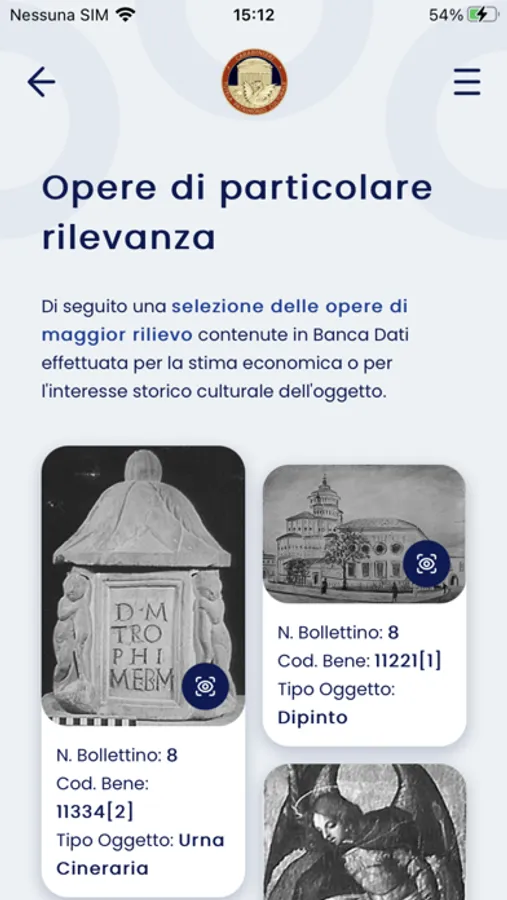 2. Ricerca visuale: questa funzionalità di ricerca visuale consente al cittadino di scegliere un’immagine e di riconoscere, in tempo reale, pregevoli opere d'arte trafugate, attraverso la comparazione di immagini con quelle contenute in un apposito archivio informatico dedicato.