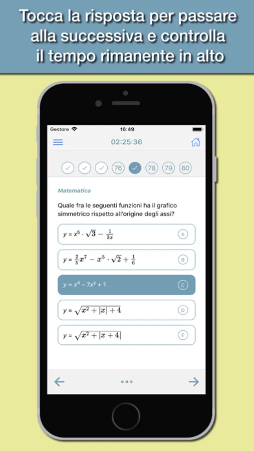 This app is built on a database of 1000 questions with their corresponding annotated solutions, and enables you to generate an unlimited number of different tests and reach a better preparation. After downloading the app, you can simulate a full test of 80 questions, similar to the actual official test, or you can choose to check your preparation in a quicker way by completing short tests with 20 questions, in order to optimize your time. In both cases, you can pause the test and resume it later, you can submit it and check the solutions, or you can abandon it and start a new test.
