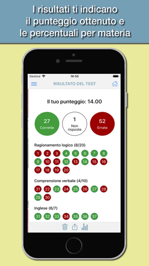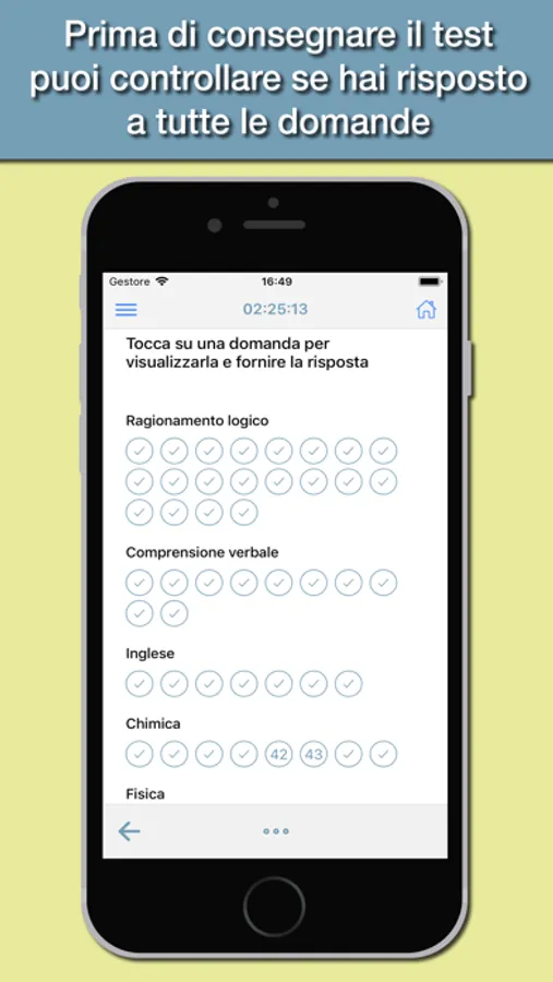 The app is designed to simulate as close as possible the test you actually have to deal with, with all the topics of the test: logical skills, text comprehension, mathematics, physics, chemistry, and English.