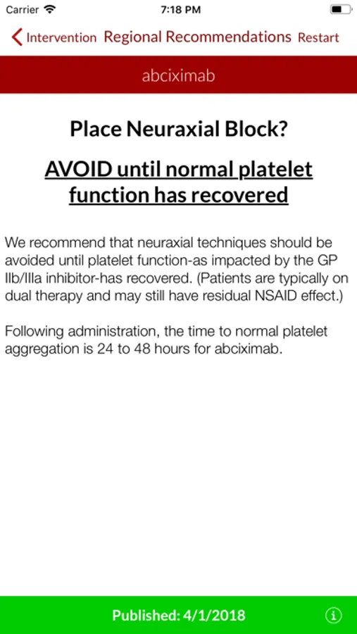 This version combines both the 2018 Regional Anesthesia guidelines from the publication “Regional Anesthesia in the Patient Receiving Antithrombotic or Thrombolytic Therapy; American Society of Regional Anesthesia and Pain Medicine Evidence-Based Guidelines (Fourth Edition)” and the 2018 Interventional Pain guidelines from the publication “Interventional Spine and Pain Procedures in Patients on Antiplatelet and Anticoagulant Medications (Second Edition); Guidelines From the American Society of Regional Anesthesia and Pain Medicine, the European Society of Regional Anaesthesia and Pain Therapy, the American Academy of Pain Medicine, the International Neuromodulation Society, the North American Neuromodulation Society, and the World Institute of Pain.”