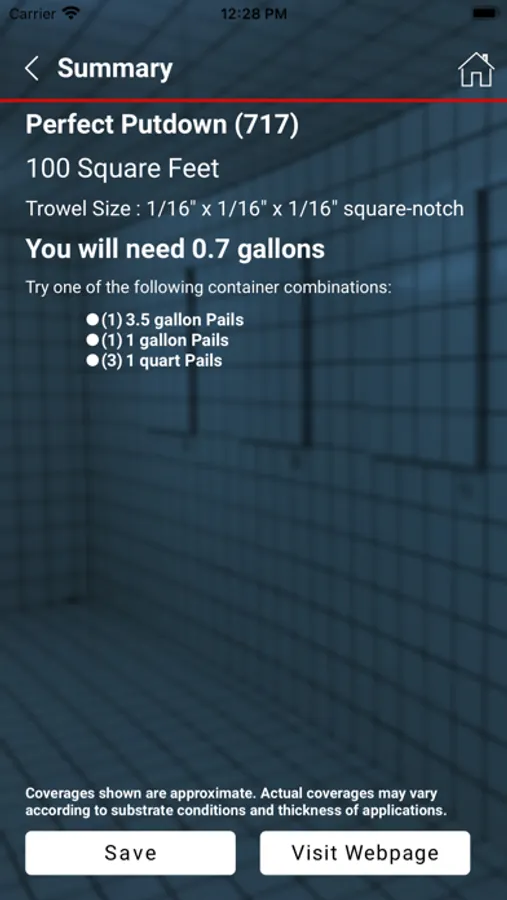 Calculate the estimated amount of surface preparation products, mortars and grouts necessary for a tile installation project. Enter your project’s specifications – including square footage, tile size and size of grout joint – and product estimates are reported in pounds and gallons and bags and pails. Save a product’s coverage summary to the “My Saved Jobs” section on the app. This feature allows you to store your projects and quickly reference them for future jobs.