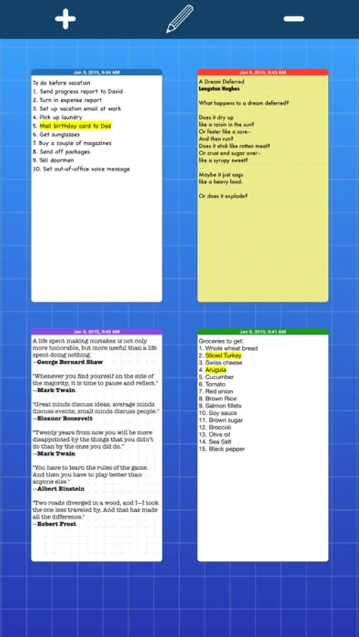 Introducing indxCards: the beautiful, lightweight, easy-to-use notes app for iPhone and iPad. Organized around the idea of notes written on index cards, use it to jot down a great idea, keep track of a favorite quote, or write up a receipe or a to-do list. See thumbnails of your notes, choose among a variety of fonts, select a paper style (lines, square, blank), and then fire off a note via e-mail (HTML-style), social media, or export it as a rich text file.
