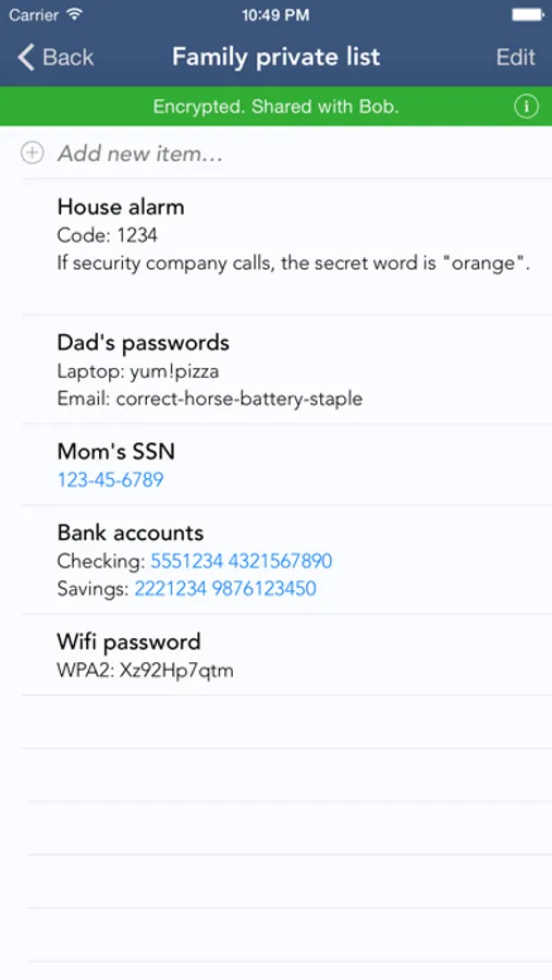 Create secure, password-protected lists for sharing private and confidential items. Password-protected lists are secured with military-grade 256-bit AES encryption. Share important financial information (account numbers, PIN codes, etc.), family passwords, intimate personal lists, and other private items – we can't read them!